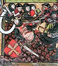 Slaget ved Stiklestad. Alterbillede fra første halvdel af 1300-tallet viser Olavs død.