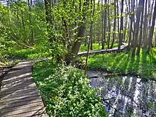 Dernæst passeres højryggede agre fra vikingtiden i skoven, fiskestryget ved Skovmøllen, hvor vandstæren ofte ses jage i vinterhalvåret, og langdyssen fra 3500 f.v.t.[6] inden man bevæger sig ind i Ellesumpen. Denne skovtype er en sjældenhed i nutidens produktionsskove, hvor man langt de fleste steder har drænet skovbunden og tilplantet med andre træarter. En gangbro bugter sig henover skovmosen, der udover elletræer har tuer med rig urtevækst med blandt andet almindelige mjødurt, småbladtet milturt og den gule engkabbeleje.[2] De ældste, flerstammede træer i sumpen er resultatet af stævningsdrift. Sidste gang disse træer blev stævnet var formentligt under 2. verdenskrig.[6]