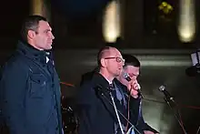 De tre ledende oppositionsledere: Vitalij Klitjko, Arsenij Jatsenjuk og Oleh Tjahnybok ved Euromajdandemonstrationerne i 2013.