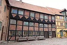 | Oluf Bager i Odense by lod her opbygge hans mødrene gård af ny. Gud unde os her så at bygge og bo at vi hos Gud må få den evige ro, sig til ære og os til gavn i faders, søns og Helligånds navn 1586.[1] | ||