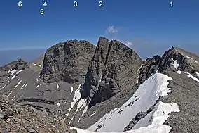 ![]() Olympen set fra Skolio: Skala (1), Mytikas (2), Stefani (3), Profitis Ilias (4), S.E.O.-Hytte (5), Touba (6) | |