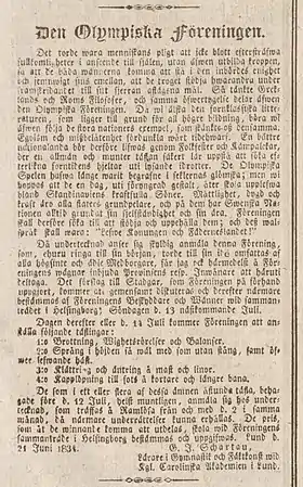 ![]() Fra 'Olympiska Föreningen' offentliggjort i Helsingborgs-Posten 28. juni 1834. ---- Resumé af opslagets nederste del: "Tävlingsgrenarna var: 1. Brottning, Wighetsrörelser och Balanser. 2. Språng i höjden, såväl med som utan stång samt över levande häst. 3. Klättring och äntring å mast och linor. 4. Kapplöpning till fots å kortare och längre banor. ... "[1][2] | |