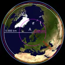 based on NASA Worldwind-globe [1] - placering af Omega-radiosender A i Norge (distances)