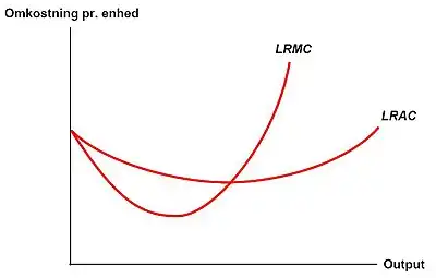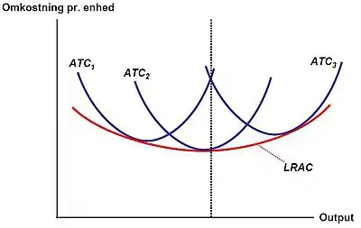 Vil man på de gennemsnitlige omkostninger over lang tid (LRAC fra engelsk long run average costs) kan dette gøres ved at se på en række forskellige mulige størrelser af faste omkostninger (lille fabrik = ATC1, mellem fabrik = ATC2, stor fabrik = ATC3):
