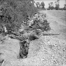 ![]() Sherman-kampvogne med infanteri venter på ordre til at rykke frem i begyndelsen af Operation Goodwood, 18. juli 1944 |