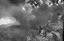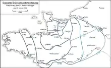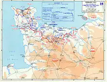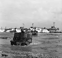 ![]() Landgangsskibe losser forsyninger på Omaha Beach under opmarchen inden udfaldet fra brohovedet. |