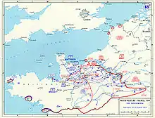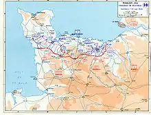 Efter landgangen i Normandiet – operation Neptune – forsøgte de allierede at udvide deres brohoveder. I den vestlige del af invasionsområdet blev de kraftigt generet af det svært gennemtrængelige bocage-landskab, mens tyskerne indsatte deres elitekampvognsenheder i den østlige del omkring Caen. I slutningen af juni blev Cherbourg erobret, men tyskerne havde forinden ødelagt havnen, så der gik måneder inden den kunne anløbes af større skibe. Midt i juli erobrede briterne Caen og amerikanerne erobrede Saint-Lô, som i operation Cobra blev udgangspunkt for det allierede gennembrud af de tyske stillinger. Herefter befriedes først det meste af Bretagne hvorefter de amerikanske styrker svingede syd om den tyske front, så der dannedes Falaise-lommen. Det lykkedes hovedparten af de tyske styrker at bryde ud af omringningen ved Falaise, men hovedparten af deres tunge våben gik tabt og de måtte hastigt trække sig tilbage over Seinen. Den 25. august nåede de allierede frem til Paris, hvor indbyggerne havde indledt en opstand nogle dage i forvejen, og ved udgangen af august beherskede de allierede området mellem floderne Loire og Seinen.