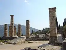 Ifølge Homer steg Apollon ned fra Olympen og rejste verden rundt "med sin vidtrækkende bue og ledte efter et orakel, som kunne tale til dødelige". Apollon holdt til ved oraklet ni måneder om året, og de laurbærskud han havde plantet rensede helligdommen.