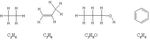 Kulstof kan danne flere typer af kovalente bindinger. Det er enkelt-, dobbelt- og tripelbindinger og den slags bindinger der findes i aromatiske ringe. For at kunne klassificere alle disse forbindelser er der lavet en systematisk navngivning under organisationen IUPAC. De systematiske navne kan hurtigt blive uoverskuelige, specielt for store molekyler og molekyler der indeholder mange forskellige funktionelle grupper, og suppleres typisk af en tegning som de viste. De viste er dog meget primitive og organiske forbindelser tegnes oftes som stregtegninger hvor der sidde et kulstofatom i hvert knæk på stregen:
