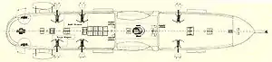 Dæksplan af Fylla 1890, med markering af de seks 87 mm kanoner. Fra Søværnets Arkiv