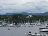 Oscarshall set fra bådhavnen i Frognerkilen