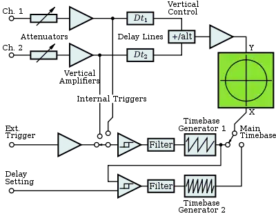 - Med to indgange skal det synkroniseringskredsløb der venter på målesignalet og sørger for at kurven bliver stående og ikke forskydes vandret, "vælge" ét af de to signaler – som regel er der også en tredje signalindgang og forstærker, hvis signal dog ikke vises på skærmen, men kan bruges som tidsmæssigt referencesignal for de to signaler der vises. En fjerde valgmulighed man ofte ser, er at billedet kan synkroniseres efter den vekselspænding der strømforsyner oscilloskopet: Hvis man f.eks. måler på en strømforsyning, vil vekselspændingerne i denne stå i et fast faseforhold til vekselstrøms-forsyningen til oscilloskopet, så denne facilitet giver en meget stabil synkronisering uanset målesignalets størrelse eller egenskaber i øvrigt.