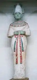 Han fremstiles oftest som en grøn gud i mumiesvøb, med den hvide krone (atef-kronen) på hovedet. På hagen bar han det symbolske gudeskæg, som kunne være en efterligning af et gedebukkeskæg. Hans trone har form af en hieroglyf der betyder sandhed, eller verdensorden.