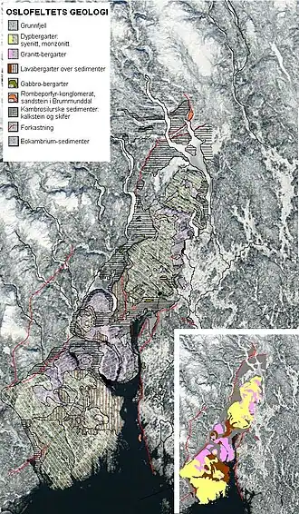 Mod det omgivende grundfjeld begrænses den af forkastninger med spring på op til 2.000-3.000 meters højde og består af i den dannede sprække indgåede magmatiske bjergarter, først og fremmest dybbjergarter som granit, syenit , monzonit og gabbro . Af de mere specielle bjergarter ses larvikit, som er en populær smykkesten. Oslofeltet har siden igen slået revner og er krydset af andre aflejringer, ofte af vulkanske bjergarter som rombeporfyr eller af diabase . Den magmatiske aktivitet i området skabte ringformede indstyrtninger af fjeldgrunden såkaldte cauldrons. I forkastningerne er også sedimentære bjergarter blevet bevaret, som ellers er blevet fejet bort af indlandsisen fra de øvrige områder, først og fremmest fra perioderne kambrium, ordovicium, silur og perm.
