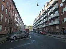 Solgården tegnet af Henning Hansen er murstensbyggeri fra 1931, åbnet for solen, lukket for uvedkommende: Skiltet ind til gården, hvor hoveddørene er, er i blå emalje og i samme skrifttype som københavnske gadeskilte 1929-89. ”Privat ejendom! Uvedkommende adgang forbudt!”