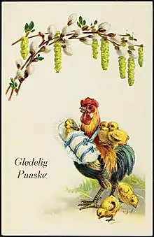 Påskekyllinger og høns er gennemgående som postkortmotiv og i forbindelse med chokoladepåskeæg i hele Norden[3] i langt højere grad end påskeharen, som er den tilsvarende skikkelse i Tyskland. Påskeharen er især blevet kendt hos os gennem vareudbuddet til påske i forretninger som Aldi og Lidl, der er tyske.[4] Påskekyllingen er en skandinavisk tradition.[5]