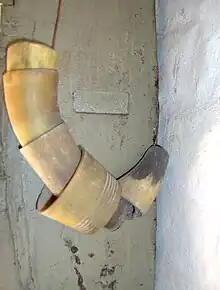 Pølsehorn af kohorn. Udstillet på Frilandsmuseet nord for København.