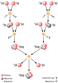 hvor H and He er isotoper af Brint og Helium, e+ er en positron (en positivt ladet elektron), γ er en gamma foton og νe er en neutrino.