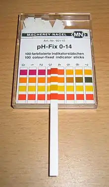 Indikatoren kan f.eks. påføres papir, så papiret kan bruges til måling af pH i stoffer, det kommer i kontakt med. Sammen med pH-papir anvendes en skala, hvor det angives, hvilken pH der svarer til de forskellige farver, som papiret kan antage. Når pH-papiret kommer i kontakt med den væske eller andet, man ønsker at måle pH for, reagerer indikatorstofferne på pH-papiret og antager en farve, der kan bruges til at bestemme, hvor sur eller basisk opløsningen eller stoffet er.