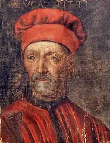 Opførelsen af denne store bygning blev bestilt i 1458 af den Florentinske bankier Luca Pitti (1398-1472), primære støtte og ven af Cosimo de' Medici. Palazzo Pittis tidlige historie er en blanding af fakta og myter. Pitti havde tilsyneladende bestemt at vinduerne skulle være større end indgangen til Palazzo Medici. Kunsthistorikeren Giorgio Vasari har foreslået, at Brunelleschi var paladsets arkitekt, og at hans elev Luca Fancelli blot var hans assistent på den opgave. Men i dag er det Fancelli, der generelt er krediteret. Udover tydelige forskelle fra den ældste arkitekts stil, så døde Brunelleschi 12 år før opførelsen af paladset begyndte. Det arkitektoniske udtryk og udførelsen af vinduer tyder på, at arkitekten var mere erfaren i utilitaristisk indenlandsk arkitektur end i de humanistiske regler, der er defineret af Alberti i sin bog' De Re Aedificatoria.[2]