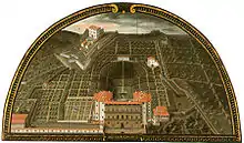 I 1616 blev der afholdt en konkurrence i designudvidelser til hovedfacaden med tre buer i hver ende. Giulio Parigi vandt Kommissionen. Arbejdet på nordsiden begyndte i 1618, og på sydsiden i 1631 af Alfonso Parigi. I løbet af det 18. århundrede blev to vinkelrette fløje konstrueret af arkitekten Giuseppe Ruggeri for at forbedre og understrege udbredelsen af via Romana, som skaber en piazza centreret på facaden. Prototypen på Cour d'honneur, der blev kopieret i Frankrig. Sporadiske mindre tilføjelser og ændringer blev lavet i mange år derefter under andre herskere og arkitekter.[6]