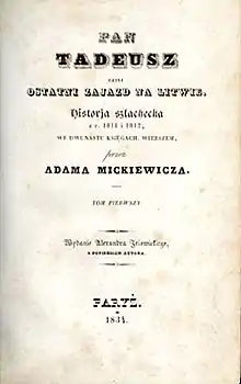 Med tolv sange og mere end ti tusind linjer anses Pan Tadeusz tit som det eneste vellykkede epos fra det 19. århundrede. Det blev udgivet første gang i 1834 i Paris. Valdemar Rørdam oversatte det til dansk.