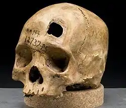 ![]() Kranium fra det 19. århundrede der viser et sværdtraume på pandebenet. | |