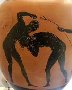 To atleter i pankrationsdyst, afbildet på amfora fra Athen fra år 332-331 f.Kr.