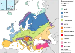 Pannonisk klima er her angivet med orange farve, der dækker dele af Slovakiet, Østrig, Serbien og Rumænien samt hele Ungarn.