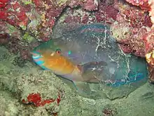 Nogle papegøjefiskarter, herunder kone-papegøjefisk (Scarus vetula), udskiller en slimkokon, især om natten.[10] Før de sover, udskiller nogle arter slim fra munden og danner en beskyttende kokon, der omslutter fisken og formodentlig skjuler dens duft for potentielle rovdyr.[11][12] Denne slimhinde kan også fungere som et tidligt advarselssystem, så papegøjefisken kan flygte, når den opdager, at rovdyr som f.eks. muræner forstyrrer membranen.[12] Selve huden er dækket af en anden slimhinde, som kan have antioxidante egenskaber, der er nyttige ved reparation skader på kroppen,[10][12] eller afvisning parasitter, ud over at den beskytter mod ultraviolet lys.[10]