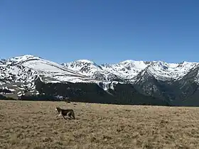 ![]() Udsigt over Parâng-bjergenes hovedkam. Toppen længst til venstre er Găuri mens den højeste top (Parângu Mare – 2.519 moh.) ses til højre for midten af billedet. | |