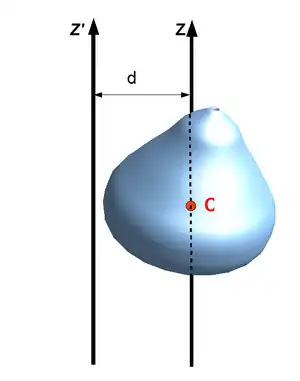 hvor er inertimomentet omkring en akse parallel med aksen igennem massemidpunktet, er inertimomentet omkring en akse igennem massemidtpunktet, er massen af legemet, og er afstanden mellem akserne.