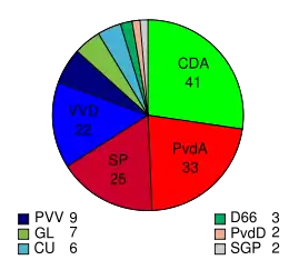 | Christen Democratisch Appèl (CDA) | 28,6 | 44 | 2,608,573 | 26,5 | 41 | |