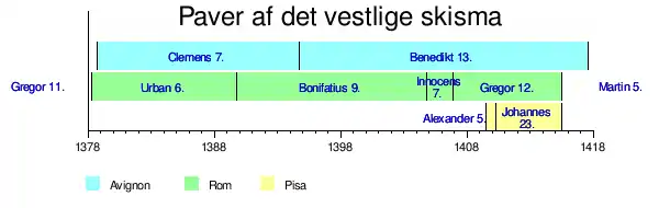 Indtil koncilet i Pisa 1409 var Gregor 12. pave i Rom og Benedikt 13. modpave i Avignon. Kirkemødet varede i 11 dage, og man enedes om, at de to paver blev erklæret for kættere, og de blev begge afsat og en tredje valgt, (Alexander 5.), men det førte kun til, at der nu var tre paver i stedet for to.