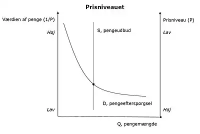 - Et højt prisniveau fører til en overefterspørgsel efter penge. Derfor vil husholdningerne og virksomhederne holde på penge og undgå at købe, hvilket vil presse prisniveauet ned pga. lavere efterspørgsel, da samfundets evne til at producere ikke har ændret sig.
