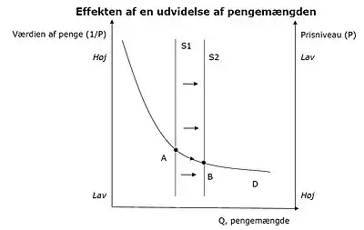 En udvidelse af pengemængden vil efter lignende ligevægtsdannende principper få prisniveauet til at falde fra A til B.