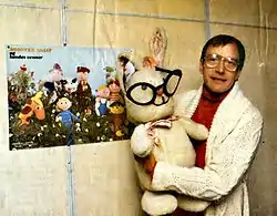 ![]() Per Nielsen med kaninen Albert, som han selv opfandt og ved plakat med Sørøver Sally | |