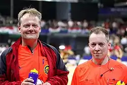 Per Olesen (th) og Lars Ejby Pedersen ved EM i håndbold 2010 (mænd)
