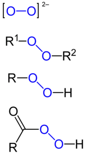 Typer af peroxider, fra top til bund: peroxid ion, organisk peroxid, organisk hydroperoxid, persyre. Gruppen af peroxider er markeret med blåt. R, R1 and R2 markerer kulbrinteforbindelser.