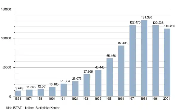 Befolkningsudviklingen i Pescara, 1861 – 2001: Grafen viser byens eksplosive udvikling i takt med masseturismens udbredelse. Siden 1980'erne er en stor del af befolkningstilgangen i stedet kommet i nabokommuner som Montesilvano, Spoltore og Città Sant'Angelo.