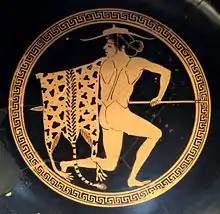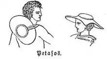 En type stridshjelm af metal som blev brugt af ryttersoldater fra Athen, havde samme form som petasos. Huller på yderkanten kan være til at fastgøre et overtræk af tekstil.