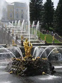 Peterhofs parker består af parkanlæg i Versailles-stil og er især kendt for sine 176 springvand og fire kaskader. Fontænerne er drevet af tyngdekraften, som gennem kanaler og sluser leder vandet ned fra et vandløb, der er placeret højere oppe på de stejle skråninger, som slottet er placeret på. Mest kendt er "Den Store Kaskade"; en vandtrappe nedenfor slottet, der består af 64 springvand og 37 forgyldte bronzeskulpturer. Den mest berømte skulptur forestiller det øjeblik, hvor Samson flår en løves kæber op. Skulpturen repræsenterer Ruslands sejr over Sverige i Den Store Nordiske Krig. Løven er en del af det svenske rigsvåben, og slaget ved Poltava blev vundet på den ortodokse helgens, Sankt Samsons, dag. Fra løvens gab springer en 21 meter lodret vandstråle op, den højeste i alle Peterhofs parker.