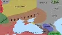Konstantin Porfyrogenitus skriver omkring 950, at Patzinakia, petjenegiernes rige, strakte sig vestfra så langt som Siret-floden (og helt til Karpaterne), og var fire dagsrejser fra "Tourkias" (det vil sige Ungarn).