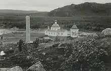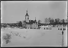 Petjenga klosterkirke i vinterlandskab omkring 1911. Præster på vej hjem.