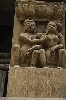 Et par udfører petting. Træskulptur på templet Uma Maheshwar i Kirtipuri i Nepal