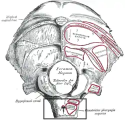 ![]() Kraniets bund, indre overflade. Pharyngeal tuberkel markeret til højre, ottende fra bunden. | |