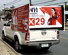 Højttalerbil med valgreklame for Paethongtarn Shinawatra.