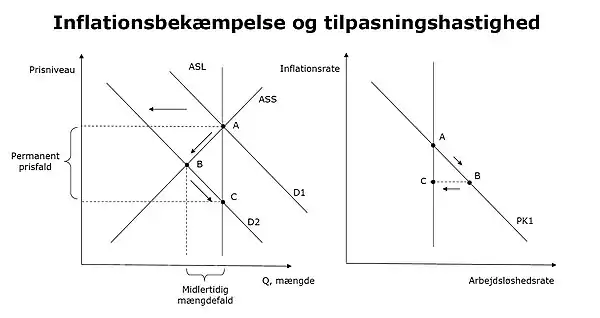 På lang sigt er aktuel inflation = forventet inflation, og på lang sigt er Phillipskurven altså lodret. Spørgsmålet har dog været, hvor hurtigt man kommer til det lange sigt. Især inden for inflationsbekæmpelse har dette spillet en rolle. I figuren nedenfor kan spørgsmålet stilles som, hvor hurtigt bevægelsen går fra A over B til C, når man laver det kontraktive indgreb (rykker AD-kurven mod venstre) gennem pengepolitikken. Nyklassiske teoretikere såsom Robert Lucas, Thomas Sargent og Robert Barro siger i teorien om rationelle forventninger, at denne tilpasning kan gå meget hurtigt, og i teorien være øjeblikkelig, hvis befolkningen på forhånd er overbevist om, at indgrebet kommer.