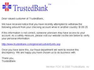 Phishing er et internetfænomen, hvor svindlere forsøger at franarre godtroende internetbrugere eller virksomheder personoplysninger, herunder brugernavn, adgangskode, kreditkort eller netbanksoplysninger. Det sker typisk ved at brugeren får tilsendt en e-mail eller f.eks. en direkte besked på Twitter, hvis indhold forsøger at få brugeren til at indsende sine oplysninger pr. e-mail eller logge ind på en falsk internetside, der ligner f.eks. bankens.[1] Mailen kan fremstå, som om den er afsendt fra et socialt medie, en auktionshjemmeside, en IT administrator eller en person fra modtagerens adressekartotek.