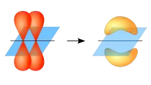 To p orbitaler danner en pi-binding. Pi-bindingen er illustreret som to orange bådformede bindinger på tegningen efter rekationspilen.